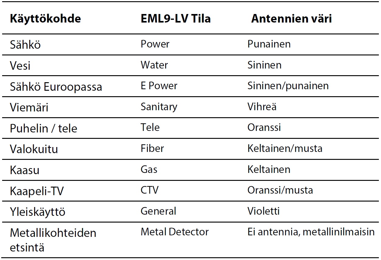 antennityyppiä. Lisäksi EML9:ssä on metallinilmaisintoiminto, jonka avulla voidaan etsiä esim.